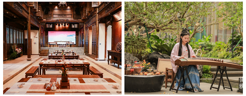 开业典礼以“海上雅集”为主题,巧妙重现宋代文人雅集的风雅场景。嘉宾踏入会场的第一步,便是通过卷轴提笔留墨的专属签到印记,仿若开启了一扇穿越时空的大门,瞬间置身于古韵四溢、宋韵流淌的唯美画卷之中。场内,古琴声声入云,笙管丝竹交织,身着宋制华服的礼仪佳丽轻歌曼舞,将嘉宾带入一场穿越时空的宋代文化之旅。雅集游园环节,更是以“点茶、焚香、插花、挂画”为主题的设计互动区域,让嘉宾亲历宋时四艺的精致与雅趣。同时,来自法国、新加坡、印度尼西亚、马来西亚的5家雅诗阁臻选物业也发来了祝贺视频,共同庆祝中国首家雅诗阁臻选的开门迎客。